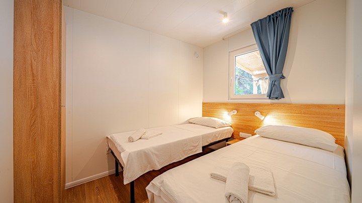 Ausstattung der Mobilheime: • Klimaanlage • Satellitenfernsehen • Sonnenliegen • Esszimmer mit Tisch und 2 Stühlen • Ausziehbare Couch für 2 Personen • Kochnische • Gasherd mit Dunstabzugshaube • Mikrowelle • Kühlschrank • Kaffeemaschine • Küchenzubehör 2 Badezimmer: • Glasduschkabine • Waschbecken • Toilette • Handtücher 2 Schlafzimmer • 1. Schlafzimmer mit Doppelbett • 2. Schlafzimmer mit Einzelbetten • Bettwäsche