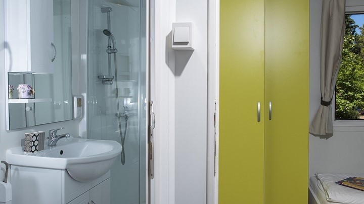 Ausstattung der Mobilheime: • Klimaanlage • Satellitenfernsehen • CD /DVD • Sonnenliegen • Esszimmer mit Tisch und 2 Stühlen • Ausziehbare Couch für 2 Personen • Kochnische • Gasherd mit Dunstabzugshaube • Mikrowelle • Kühlschrank • Kaffeemaschine • Küchenzubehör 2 Badezimmer: • Glasduschkabine • Waschbecken • Toilette • Handtücher 2 Schlafzimmer • 1. Schlafzimmer mit Doppelbett • 2. Schlafzimmer mit Einzelbetten • Bettwäsche