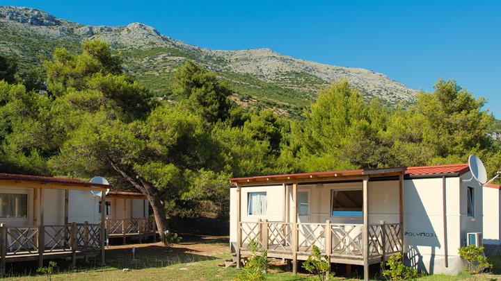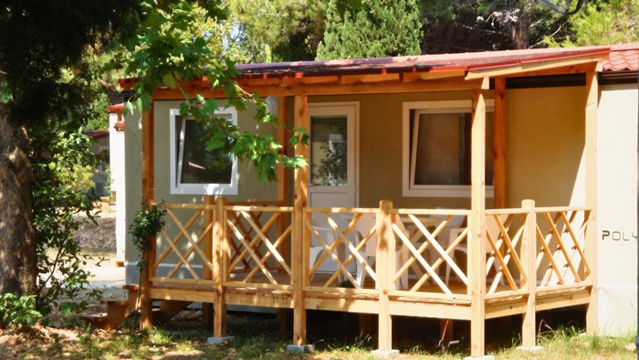 • ukupna površina: 24 m² • dimenzije mobilne kućice: 8 x 3 m • broj ležaja: 4 osnovna + 1 pomoćni • 2 spavaće sobe • kuhinja / blagovaonica • 1 kupaonica • drvena natkrivena terasa veličine: 4 x 2,5 m • parkirno mjesto • klima uređaj • SAT TV