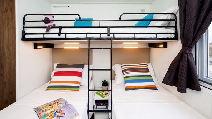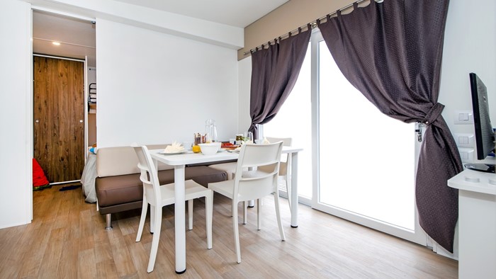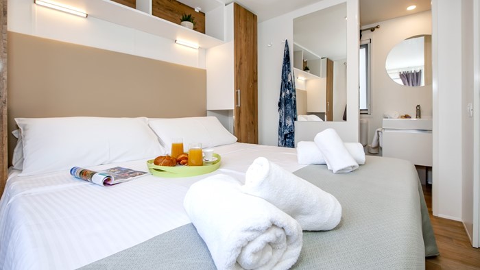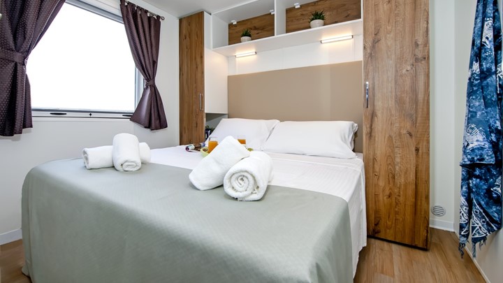 • ukupna površina: 35 m² • dimenzije mobilne kućice: 8 x 4,4 m • broj ležaja: 5 osnovna • 2 spavaće sobe • kuhinja / blagovaonica • 2 kupaonice • drvena natkrivena terasa veličine: 6 x 2,5 m • parkirno mjesto • klima uređaj • SAT TV
