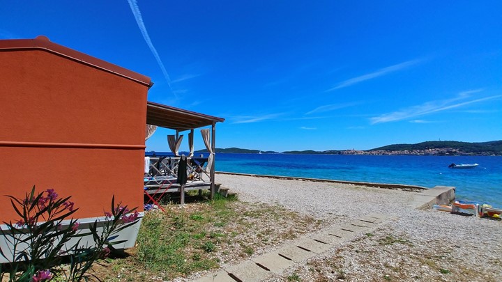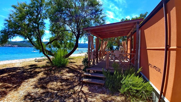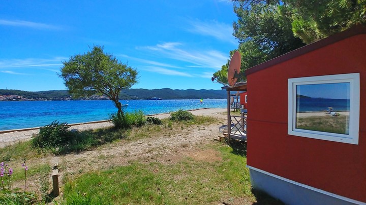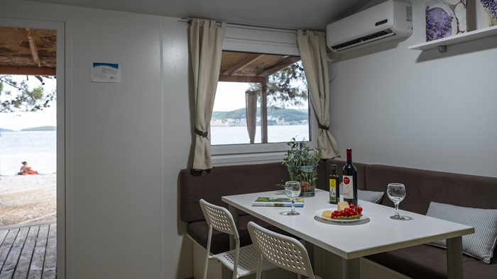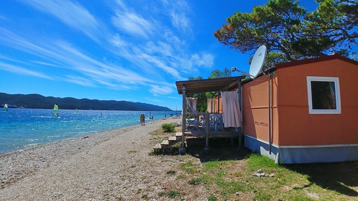 • Površina: 32m² • Dimenzije: 8 x 4 m • Broj ležaja: 4 osnovna + 2 pomoćna • 2 spavaće sobe • kuhinja / blagovaonica • 2 kupaonice • Drvena natkrivena terasa veličine: 4 x 2,5 m • Pozicija: 1. red uz plažu