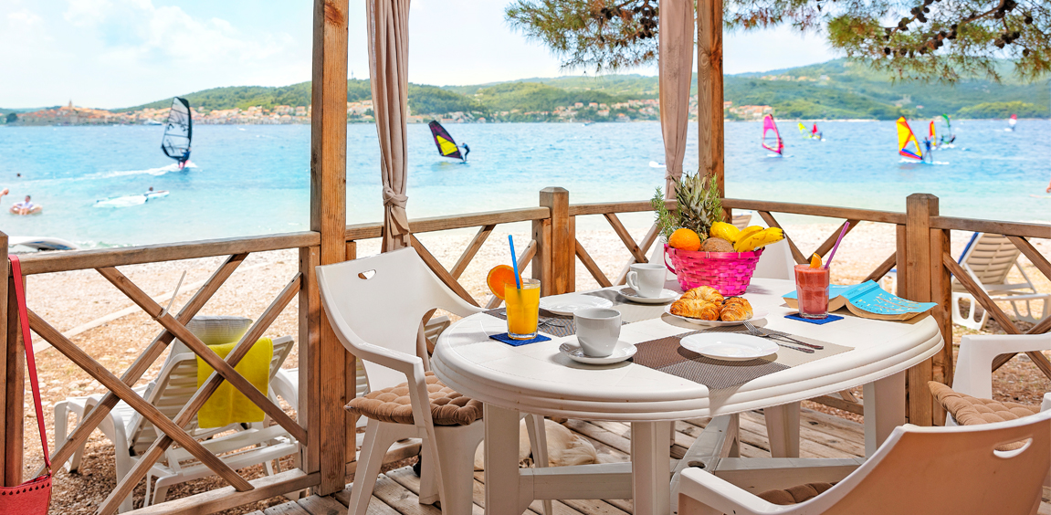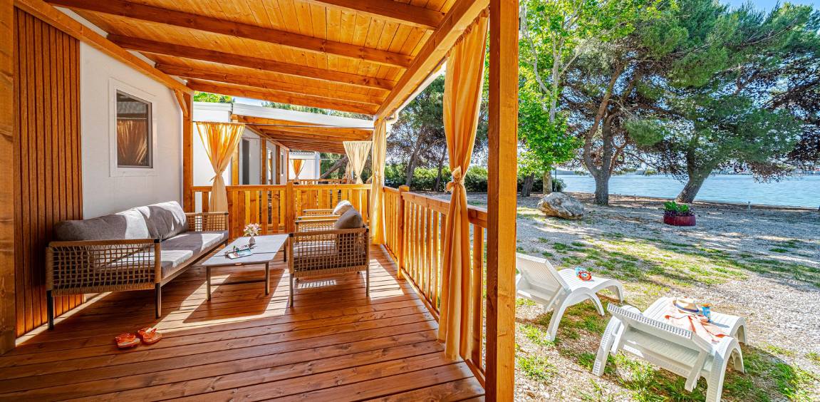 Premium 1st line mobilne kućice imaju direktan pristup obali. Gosti sa svoje terase mogu uživati u pogledu na more, plažu i otok Korčulu.