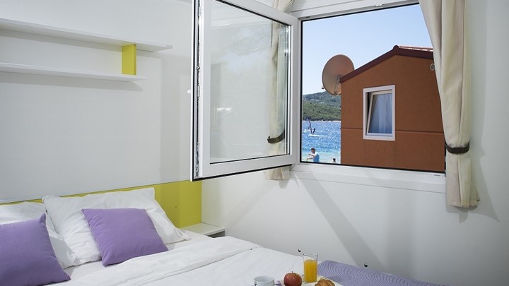 Ausstattung der Mobilheime: • Klimaanlage • Satellitenfernsehen • CD /DVD • Sonnenliegen • Esszimmer mit Tisch und 2 Stühlen • Ausziehbare Couch für 2 Personen • Kochnische • Gasherd mit Dunstabzugshaube • Mikrowelle • Kühlschrank • Kaffeemaschine • Küchenzubehör 2 Badezimmer: • Glasduschkabine • Waschbecken • Toilette • Handtücher 2 Schlafzimmer • 1. Schlafzimmer mit Doppelbett • 2. Schlafzimmer mit Einzelbetten • Bettwäsche
