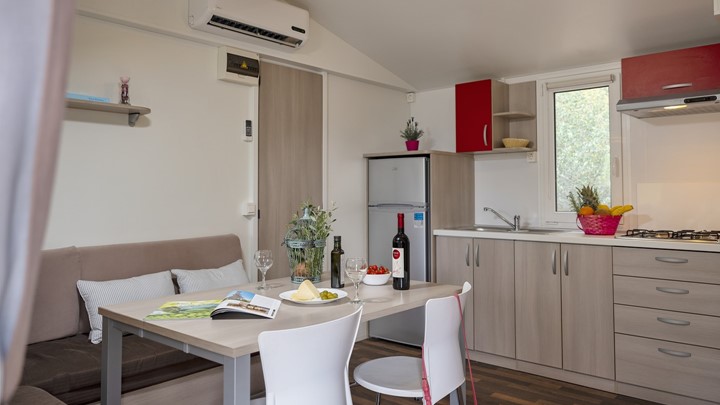 Equipment in mobile homes: • air conditioning • SAT TV • Dining room with a table and two chairs • Sofa with 2 sleeping places • Kitchenette • Gas cooker with hood • Refrigerator • Kitchen accessories Bathrooms: • Shower with Glass doors • Washing stand • Toilet • Towels Bedrooms: • 1 bedroom with double bed • 2 bedroom with twin beds • Linen