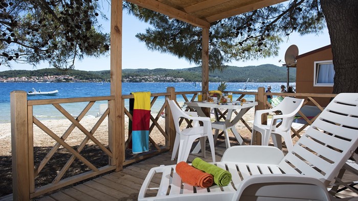 • Površina: 32m² • Dimenzije: 8 x 4 m • Broj ležaja: 4 osnovna + 2 pomoćna • 2 spavaće sobe • kuhinja / blagovaonica • 2 kupaonice • Drvena natkrivena terasa veličine: 4 x 2,5 m • Pozicija: 1. red uz plažu